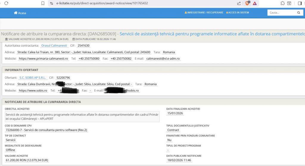 - și un alt contract pentru servicii de asistenţă tehnică pentru programele informatice aflate în dotarea compartimentelor din cadrul Primăriei oraşului Călimăneşti – compartimentul Registratură încheiat cu S.C. SOBIS SOLUTIONS S.R.L, in valoare de 14 400 RON (2842 EUR)