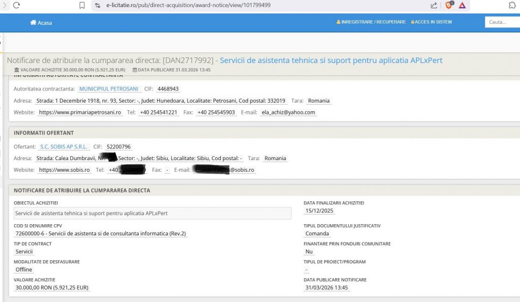 Datele publice arată o diferență destul de mare la același tip de serviciu. În decembrie 2025, Primăria Petroșani a încheiat un contract cu aceeași firmă. S.C. SOBIS AP S.R.L. pentru suport tehnic la APLxPERT în valoare de doar 30000 lei , adică aproape jumătate față de cele 61200 lei plătite de Călimănești. Desigur, diferența de preț poate veni din mai mulți factori: număr mai mare de utilizatori, pachete de servicii mai extinse, intervenții la sediu sau alte module suplimentare…