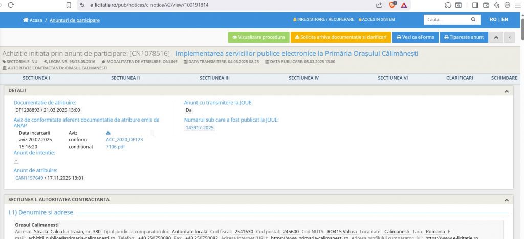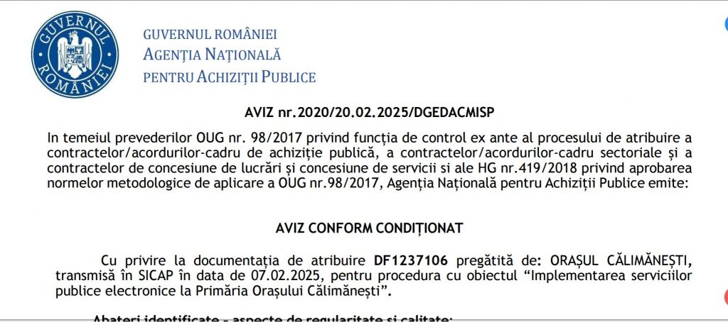 Un proiect european de peste 2 milioane de lei pentru digitalizarea Primăriei Călimănești a fost lansat în procedură de achiziție publică cu abateri semnalate oficial de Agenția Națională pentru Achiziții Publice (ANAP). Documentele consultate de redacția calimanesti.com arată că documentația inițială a conținut cerințe tehnice neclare, mențiuni la mărci comerciale și lipsa justificării valorii estimate. Avizul conform condiționat a fost emis pe 20 februarie 2025, iar documentația corectată a ajuns abia pe 21 martie 2025 în SICAP adică exact o lună mai târziu.