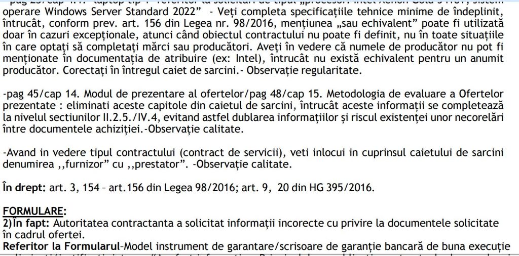 „Pentru a evita confuzii… precizați sintagma „minim” sau „maxim”, sau un interval… deoarece astfel cum sunt solicitate, unele dintre cerințe pot conduce către o anumită marcă/operator economic, încălcând astfel principiul tratamentului egal”, se arată negru pe alb în aviz. Printre exemplele concrete: servere cu „Ram 128GB”, procesoare „Intel Xeon Gold 5418Y” sau sisteme de operare „Windows Server Standard 2022” menționate fără formularea „sau echivalent” și fără justificare.