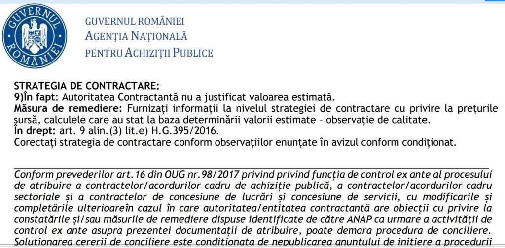 Cea mai „dură” observație a venit la „strategia de contractare”: Primăria nu justificase deloc valoarea estimată a contractului! „Furnizați informații… cu privire la prețurile sursă, calculele care au stat la baza determinării valorii estimate”, au scris inspectorii ANAP.