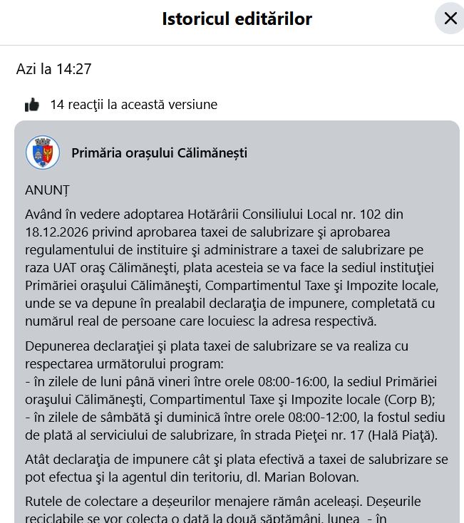 Astăzi, cam la aceeași oră când stăteam la semafor și am făcut pozele postate in articol ,  apare comunicatul privind adoptarea Hotărârii Consiliului Local nr. 102 din 18.12.2025 (inițial, comiseseră o mică greșeală, menționând anul 2026), referitor la aprobarea taxei de salubrizare și a regulamentului de instituire și administrare a acesteia pe raza UAT Călimănești. Potrivit anunțului public, plata taxei se realizează la sediul Primăriei orașului Călimănești – Compartimentul taxe și impozite locale (Corp B), în baza unei declarații de impunere completate cu numărul real de persoane care locuiesc la adresă. Programul este extins inclusiv în weekend, iar declarația și plata pot fi efectuate și prin agentul din teritoriu, domnul Marian Bolovan. De asemenea, administrația precizează că rutele de colectare a deșeurilor menajere rămân neschimbate, iar deșeurile reciclabile se colectează o dată la două săptămâni: lunea, în Căciulata, Călimănești și Seaca (malul drept al Oltului); marțea, în Păușa, Jiblea Veche și Jiblea Nouă (malul stâng).