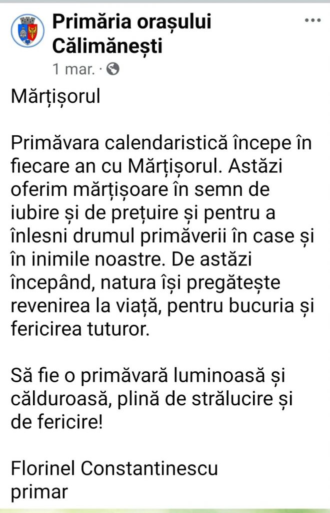 Aceste postări, deși aparent inofensive și menite să creeze o imagine pozitivă a primarului Florinel Constantinescu, devin problematice când sunt contrastate cu lipsa de comunicare clară privind aspecte esențiale precum taxele și impozitele locale. De exemplu, dacă modificările recente la Codul Fiscal (cum ar fi ajustările la impozitele pe proprietate sau facilitățile pentru investiții locale) ar putea duce la reduceri pentru cetățeni, de ce nu sunt anunțate public cu aceeași promptitudine ca urările de primăvară? Aceasta sugerează o strategie de comunicare superficială, axată pe simboluri efemere precum mărțișoarele și florile, care nu aduc beneficii concrete, în detrimentul informațiilor practice care ar putea ușura povara fiscală a locuitorilor!