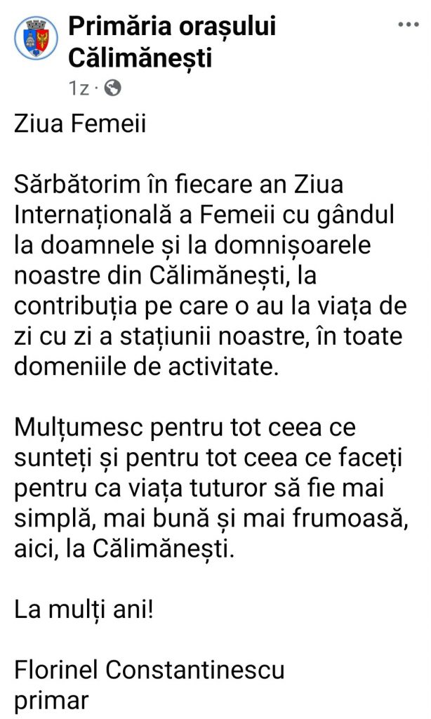 și de  8 martie de Ziua Femeii : ( „Ziua Femeii – Sărbătorim în fiecare an Ziua Internațională a Femeii cu gândul la doamnele și la domnișoarele noastre din Călimănești, la contribuția pe care o au la viața de zi cu zi a stațiunii noastre, în toate domeniile de activitate. Mulțumesc pentru tot ceea ce sunteți și pentru tot ceea ce faceți pentru ca viața tuturor să fie mai simplă, mai bună și mai frumoasă, aici, la Călimănești. La mulți ani! Florinel Constantinescu – primar”).